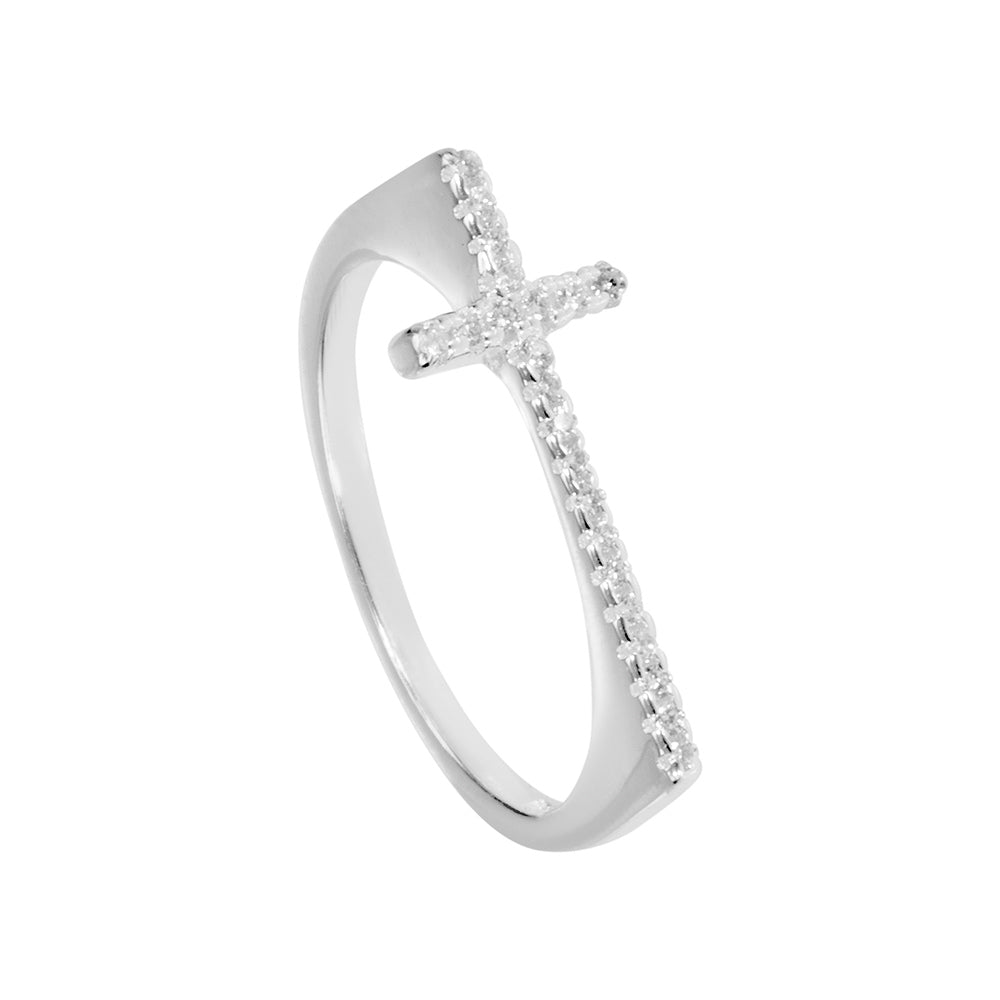Silver sideways CZ cross ring - N