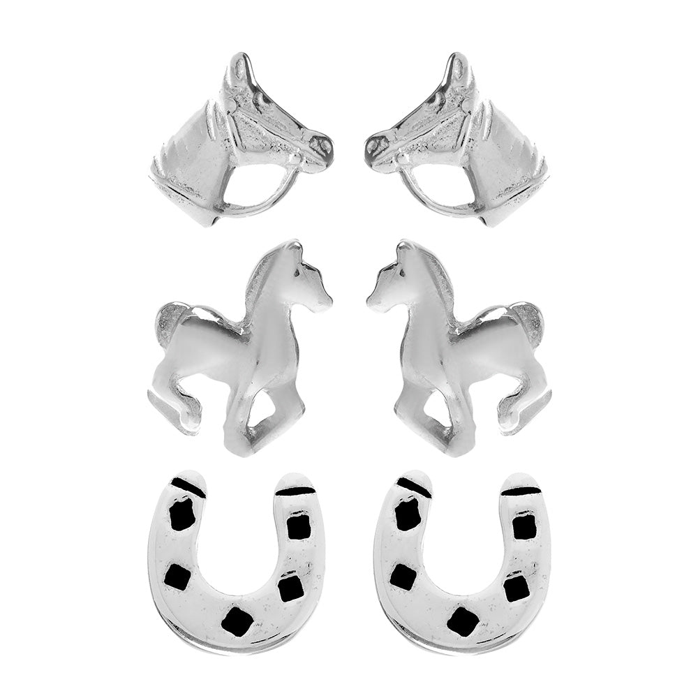 Silver TRIO Studs, full Horse, horse head, horseshoe oxidize