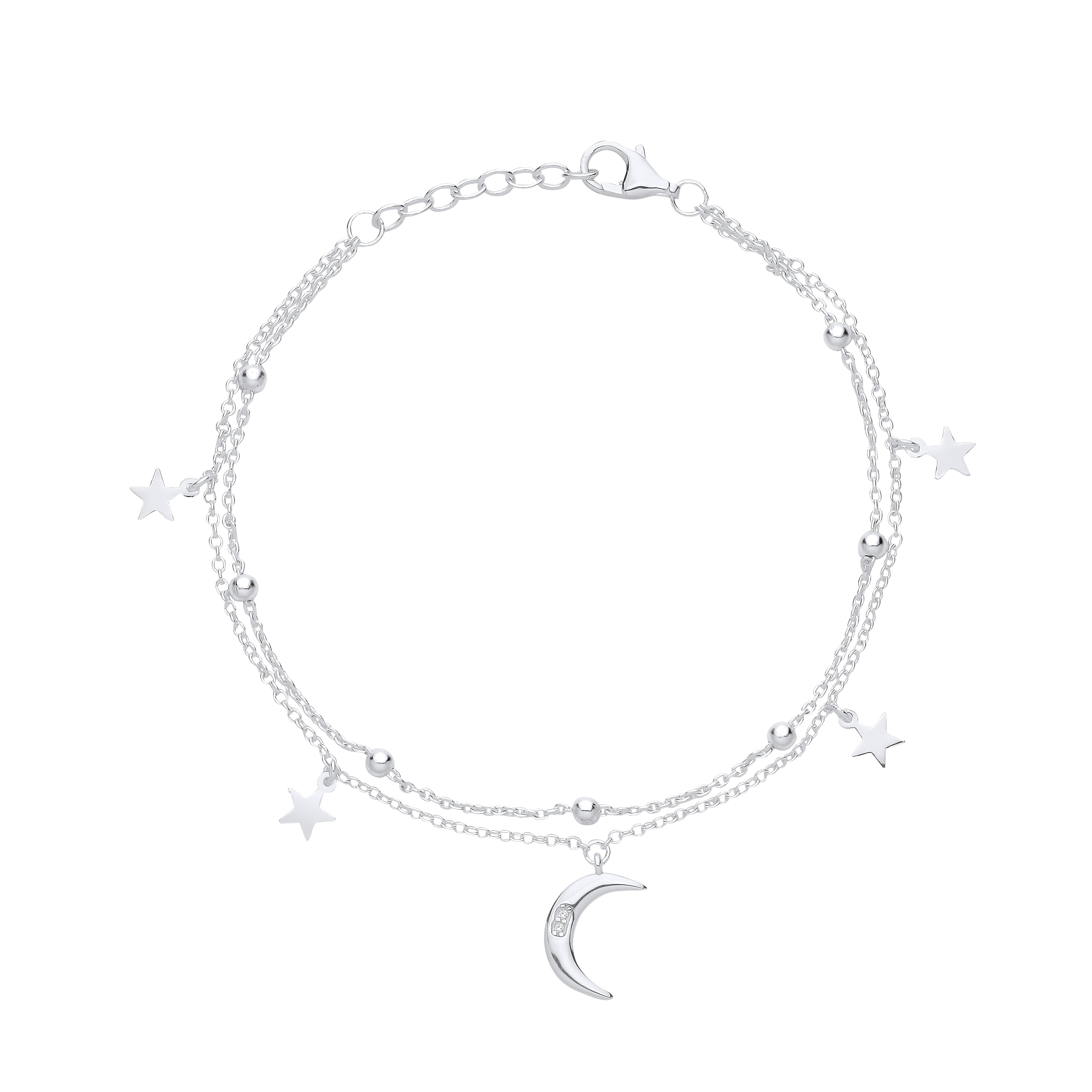 Silver double bracelet, star, moon (11*7.7) 6.2"+1, diamond - 0.8mm*2