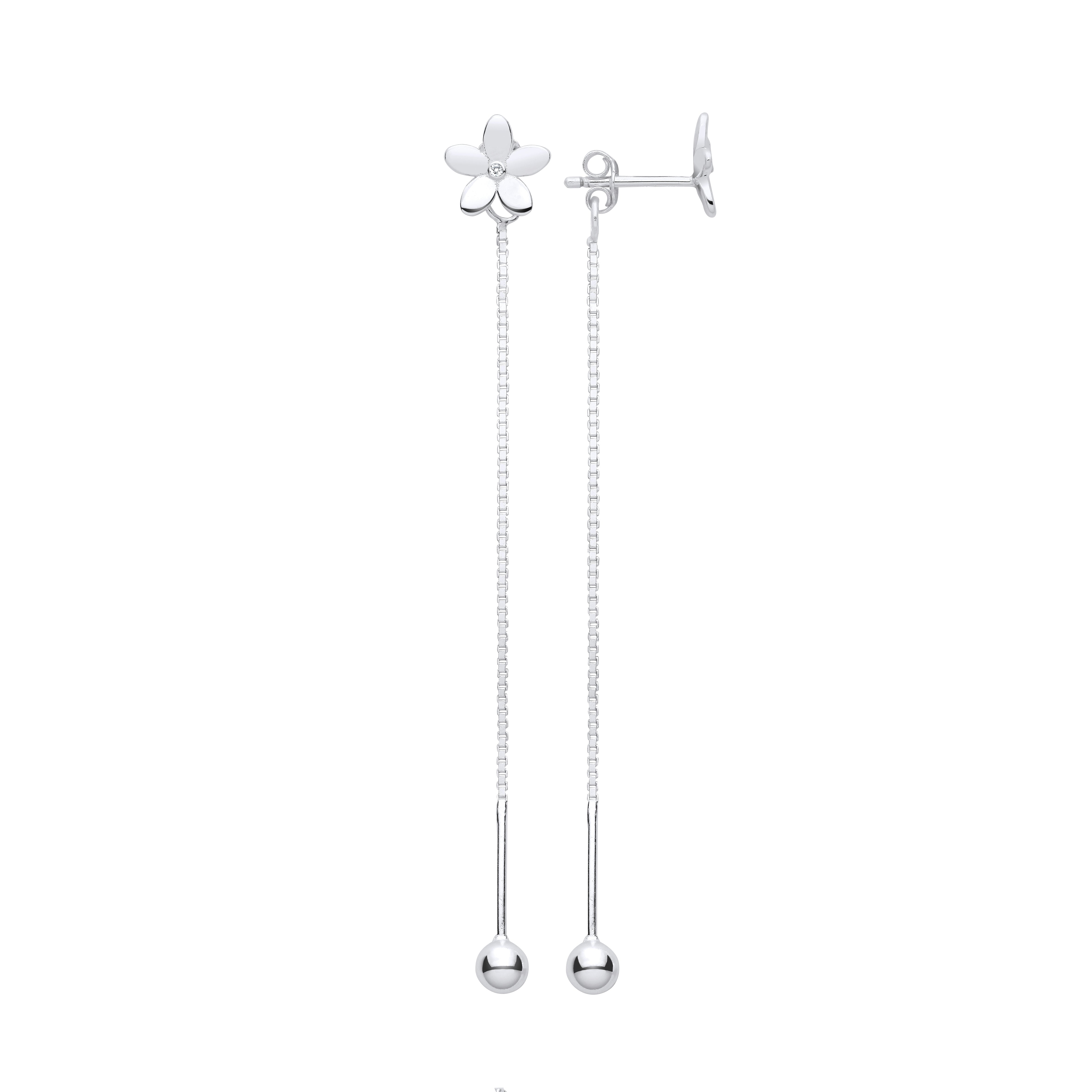 Silver flower stud with long chain dropper 55mm. diamond - 0.8mm