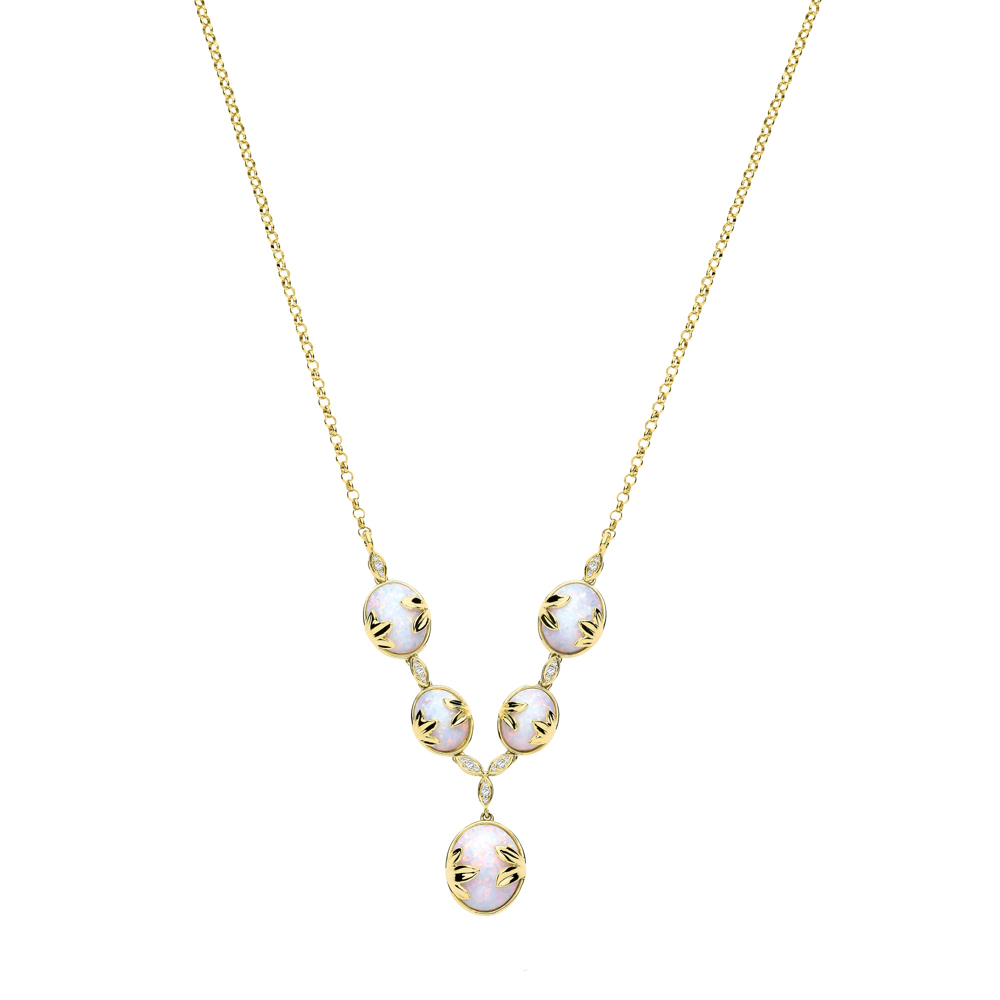 9ct y/g belcher - Oval & round C.Opal - CZ - LEAF design - 19"