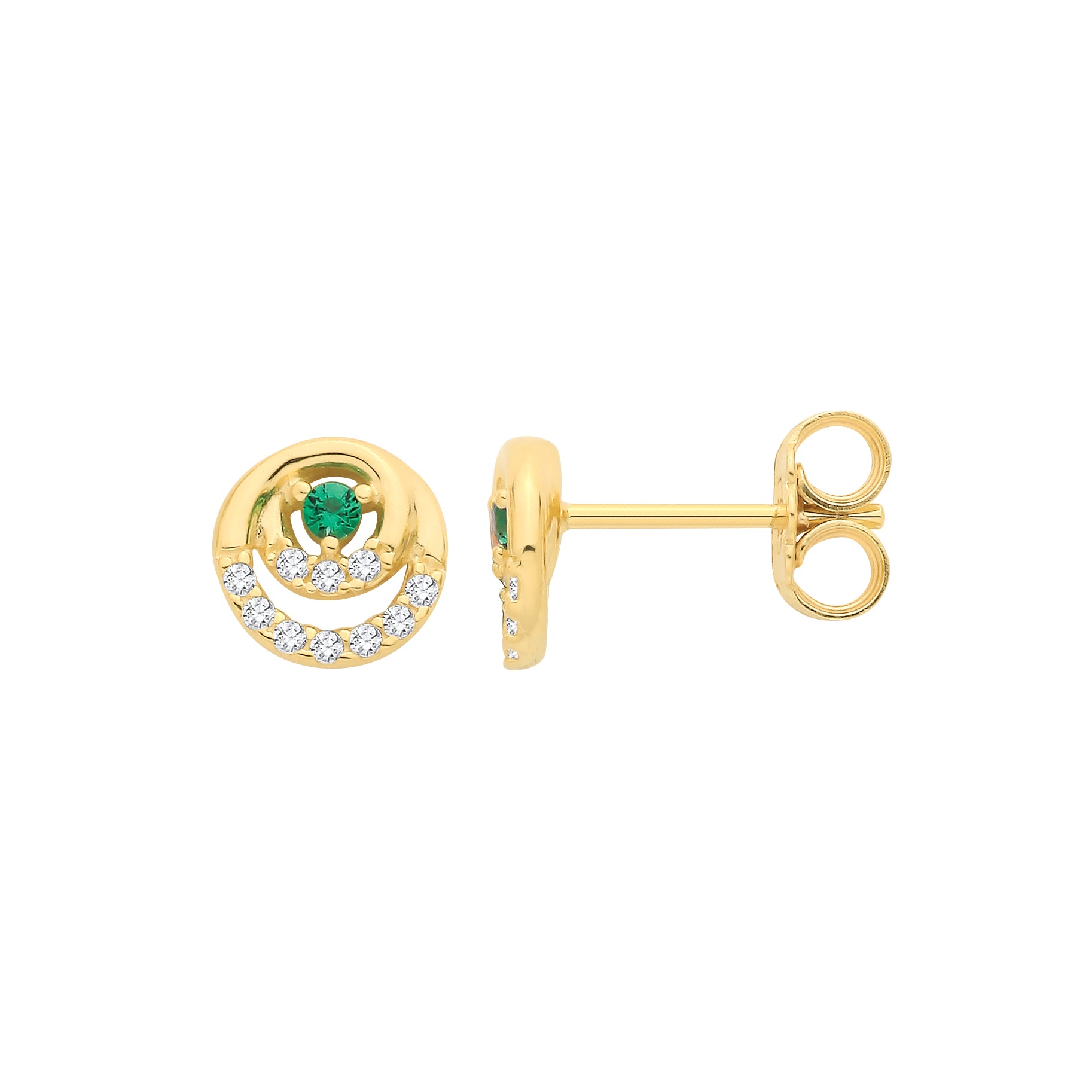 9ct round stud with cz swirls and a green cz centre