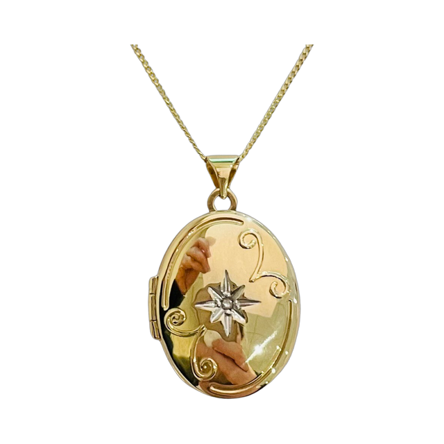9ct Yellow gold Oval Locket. Star with Diamond and Swirls design