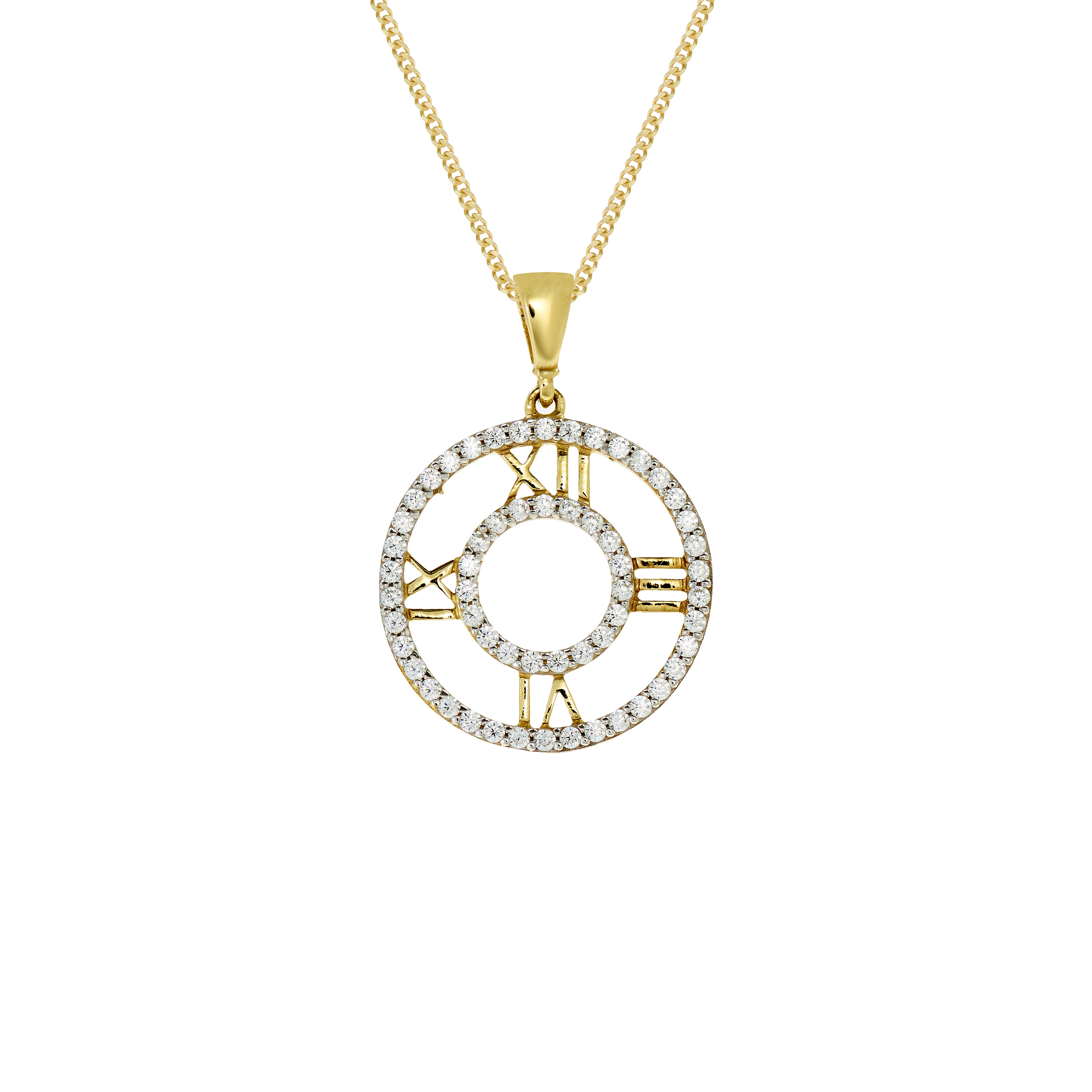 9ct Yellow gold CZ Circle Pendant with Open Clock Face