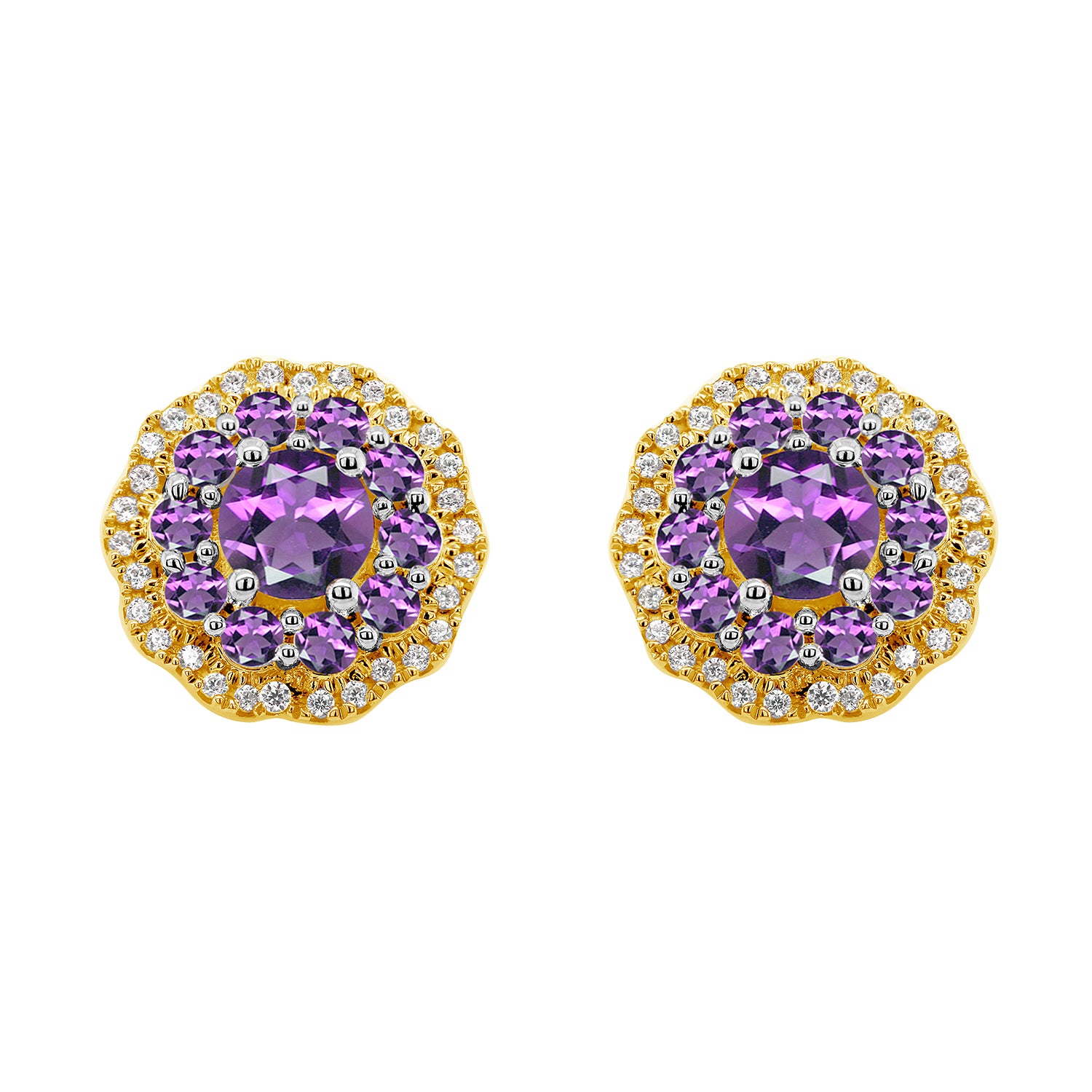 9ct Y/G Flower studs, dia 0.18ct, amethyst 1.14ct SI1/2 G/H