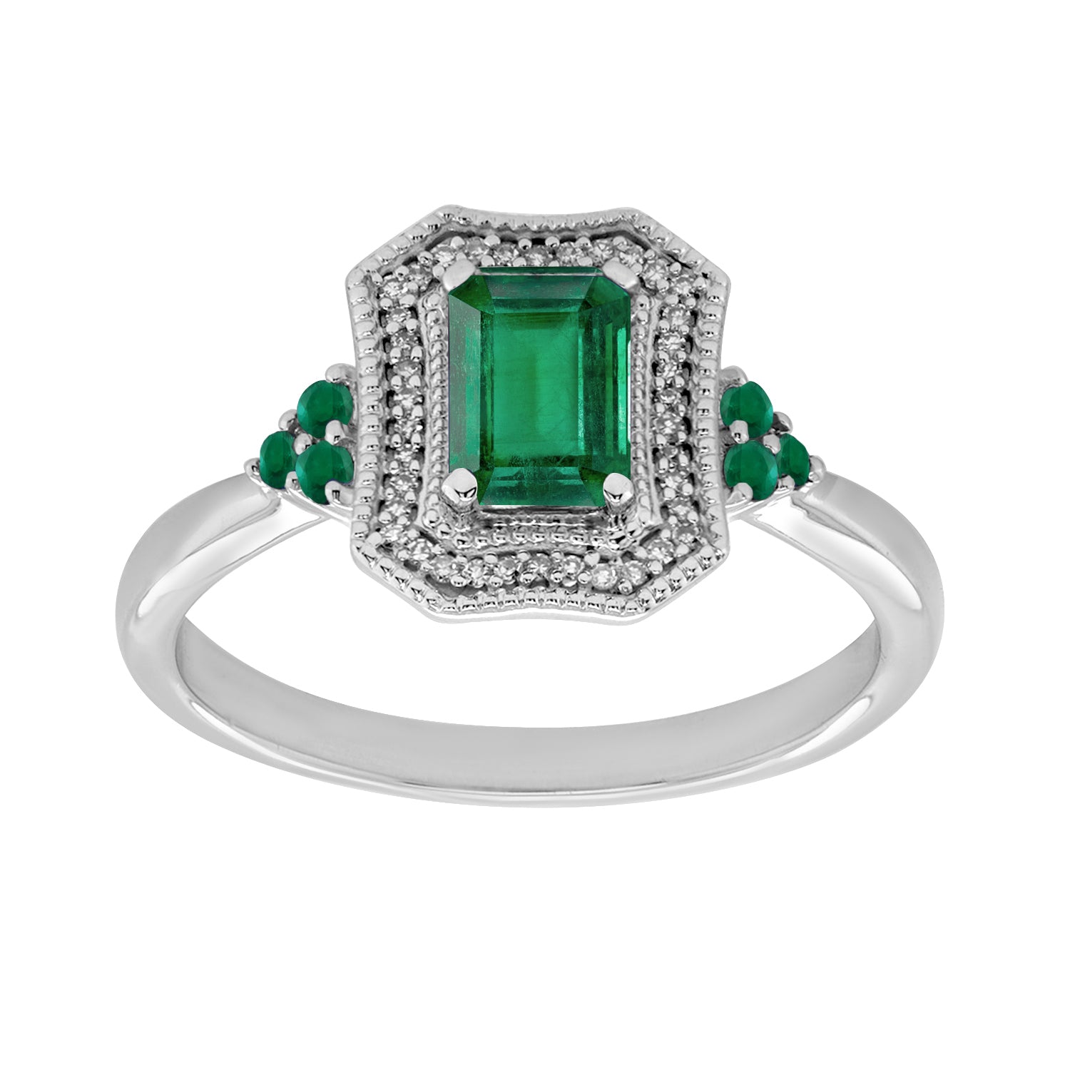 9ct W/G Sheild Ring, dia 0.06, emerald 0.74ct SI1/2 G/H