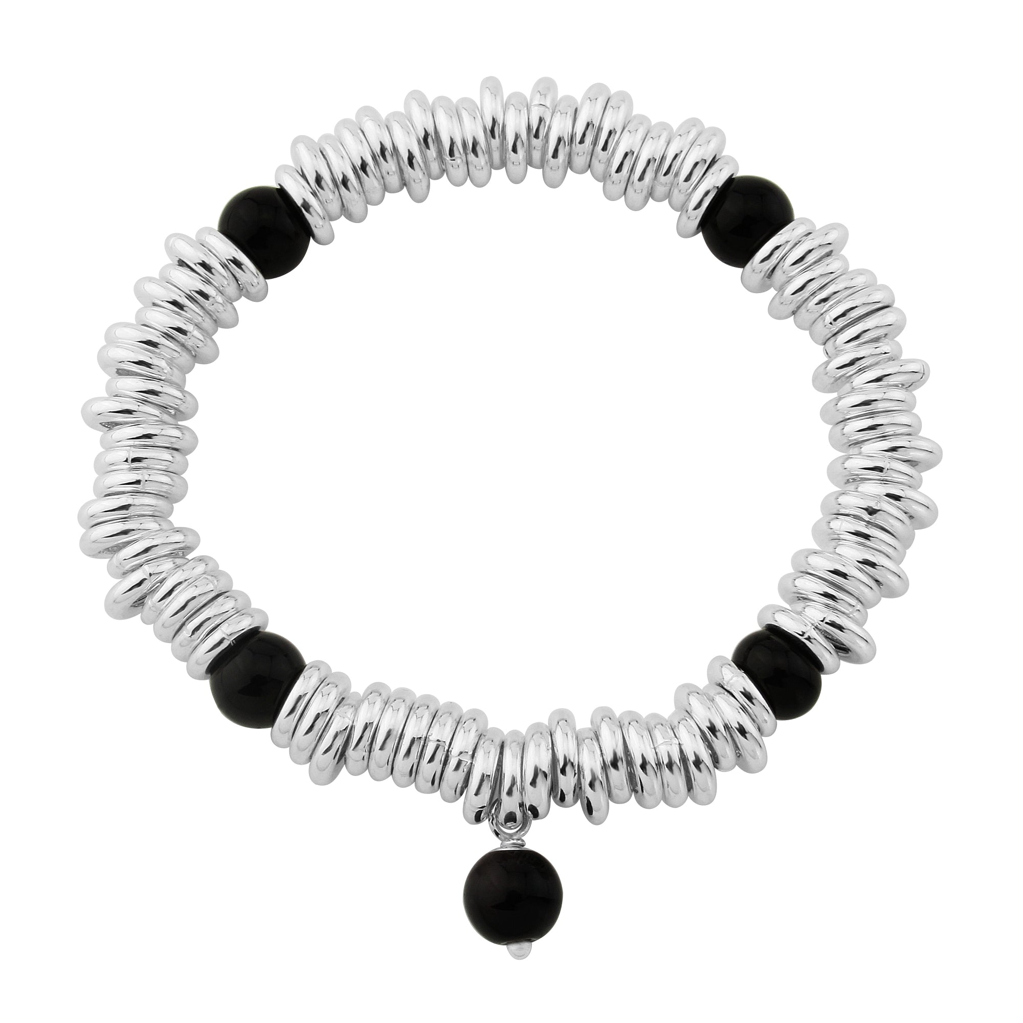 Silver Bracelet filled with med sized hoops & 5 black beads