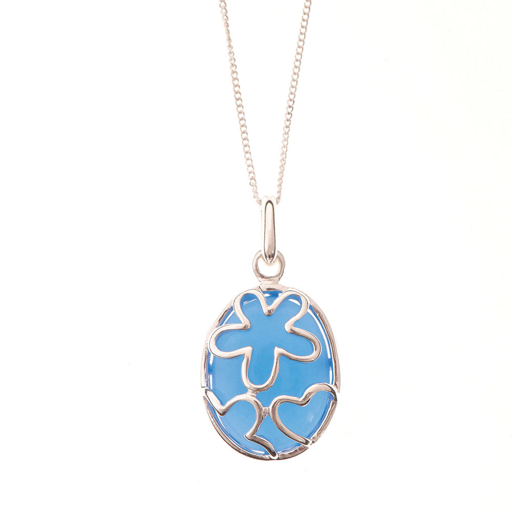Silver Blue Milky stone with flower/heart outline 20mm deep including chain