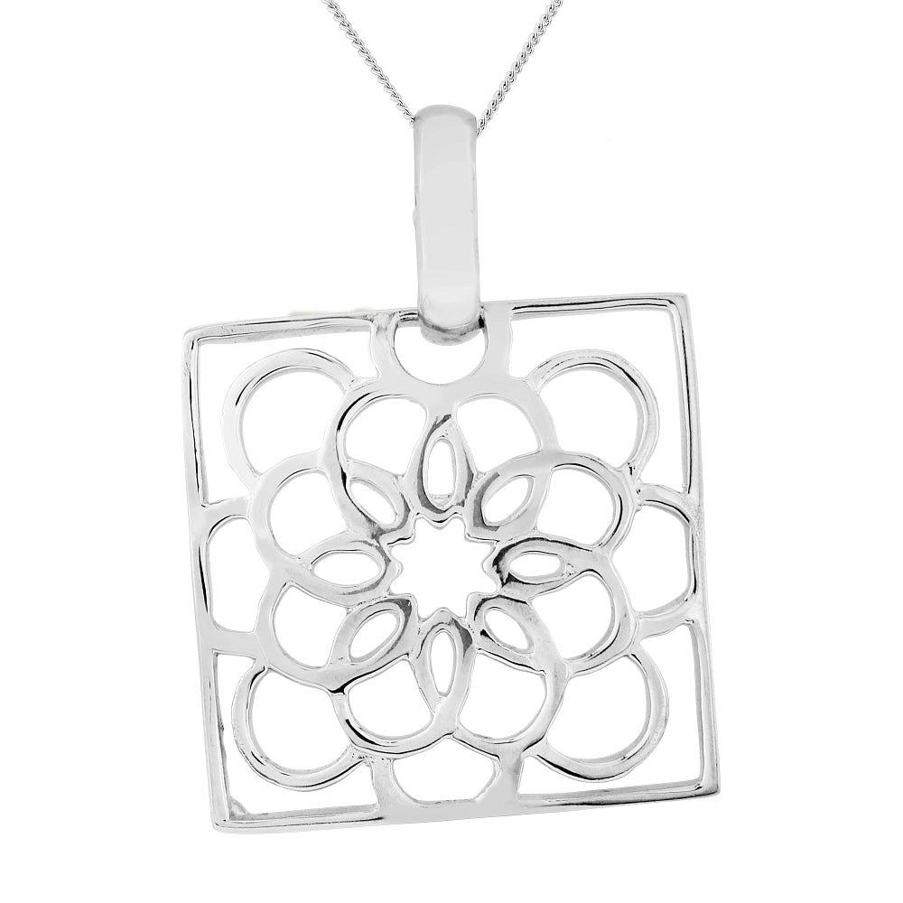 Silver Pend. Square Pendant with a large flower shape inside including chain