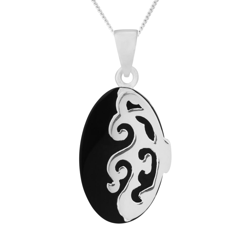 Silver oval onyx pendant with silver swirls including chain
