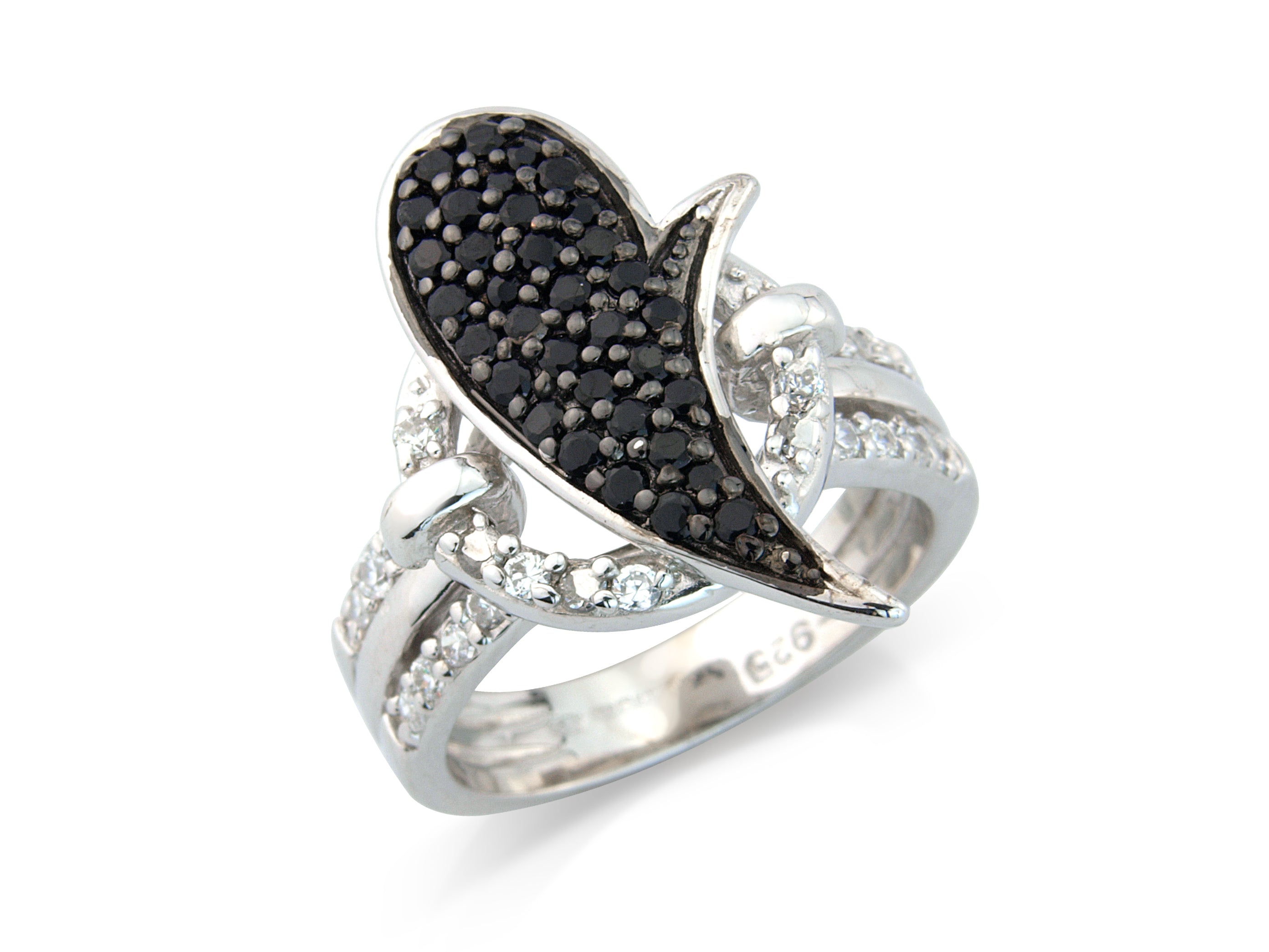 Silver Ring. CZ shoulder. Large black tear shape Black CZ's