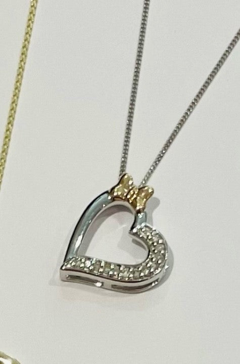 9ct White Gold Heart, Dia 0.05ct with Rose gold bow